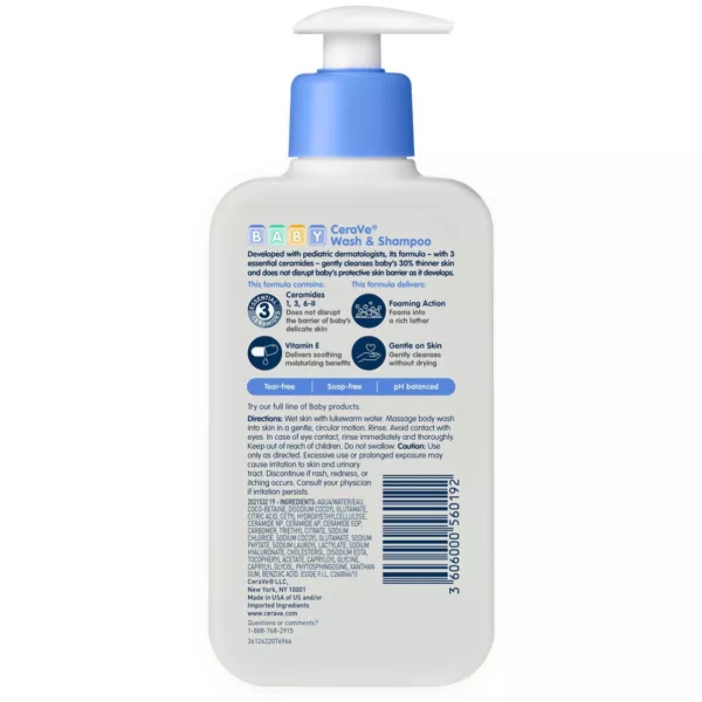 Developed with pediatric dermatologists, CeraVe Baby Wash & Shampoo contains 3 essential ceramides to ...help maintain baby’s delicate skin barrier. This tear-free formula cleanses without irritation and leaves baby hair and skin feeling fresh and clean. This 2-in-1 product is ideal for a simple baby bath time and is developed with pediatric dermatologists.