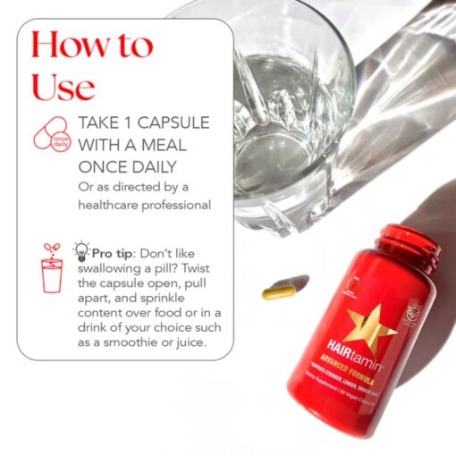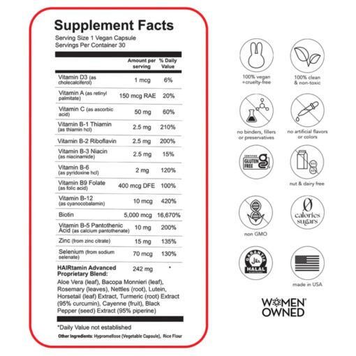 HAIRtamin Advanced Formula is a physician-formulated, clean, one-a-day, hair nourishing supplement with clinically-studied, vegan ...ingredients that can help maintain stronger, longer, thicker-looking hair. Our proprietary blend of essential hair-loving vitamins, minerals and herbs, plus a potent super antioxidant complex, synergistically work together to help maintain healthy hair growth, retention and follicle strength from the inside out.