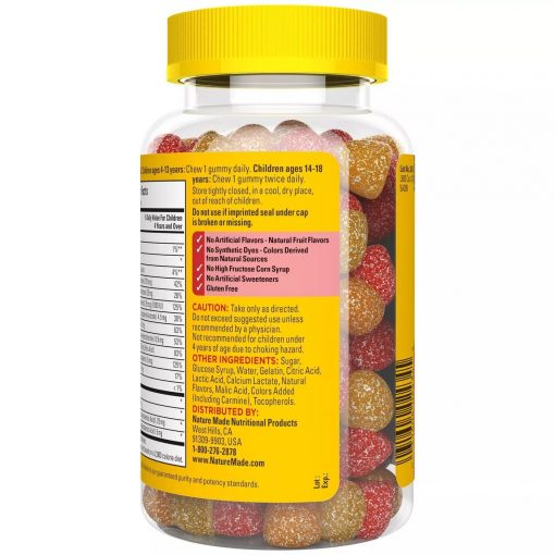 These Nature Made kids multivitamin with omega 3 gummies are dietary supplements that are specially ...formulated to help growing children get the nutritional support they need. Sourced from high-quality ingredients, this gluten free multivitamin nutritional support supplement has no artificial flavors, no synthetic dyes, no high fructose corn syrup, and no artificial sweeteners. These kids multivitamin gummies provide nine essential nutrients, including Vitamin A to support healthy eye function, and B vitamins to support cellular energy production, plus heart healthy Omega-3s. This Nature Made Kids First Multivitamin with Omega-3 is a children’s multivitamin that also contains Vitamin D to help support bone health and tooth development, plus Vitamin C and Vitamin E for antioxidant support and immune support. Each serving of this kids multivitamin provides 30 mg of EPA and DHA Omega-3 fatty acids. Made with natural fruit flavors, these Nature Made multivitamins have delicious strawberry, lemon, and orange flavors to help your kids enjoy taking their daily multi dietary supplement. Children ages 4-13 chew one of these Nature Made multivitamin gummies daily. Children ages 14-18 chew one of these kids multivitamin gummy dietary supplements twice daily. Nature Made supplements are quality you can trust. CAUTION: Take only as directed. Do not exceed suggested use unless recommended by a healthcare professional. Not recommended for children under 4 years of age due to choking hazard. Suggested Age: 4 Years and Up Multivitamin type: Children’s Vitamin Note : All Exubuy products are imported to Bangladesh from the United States.