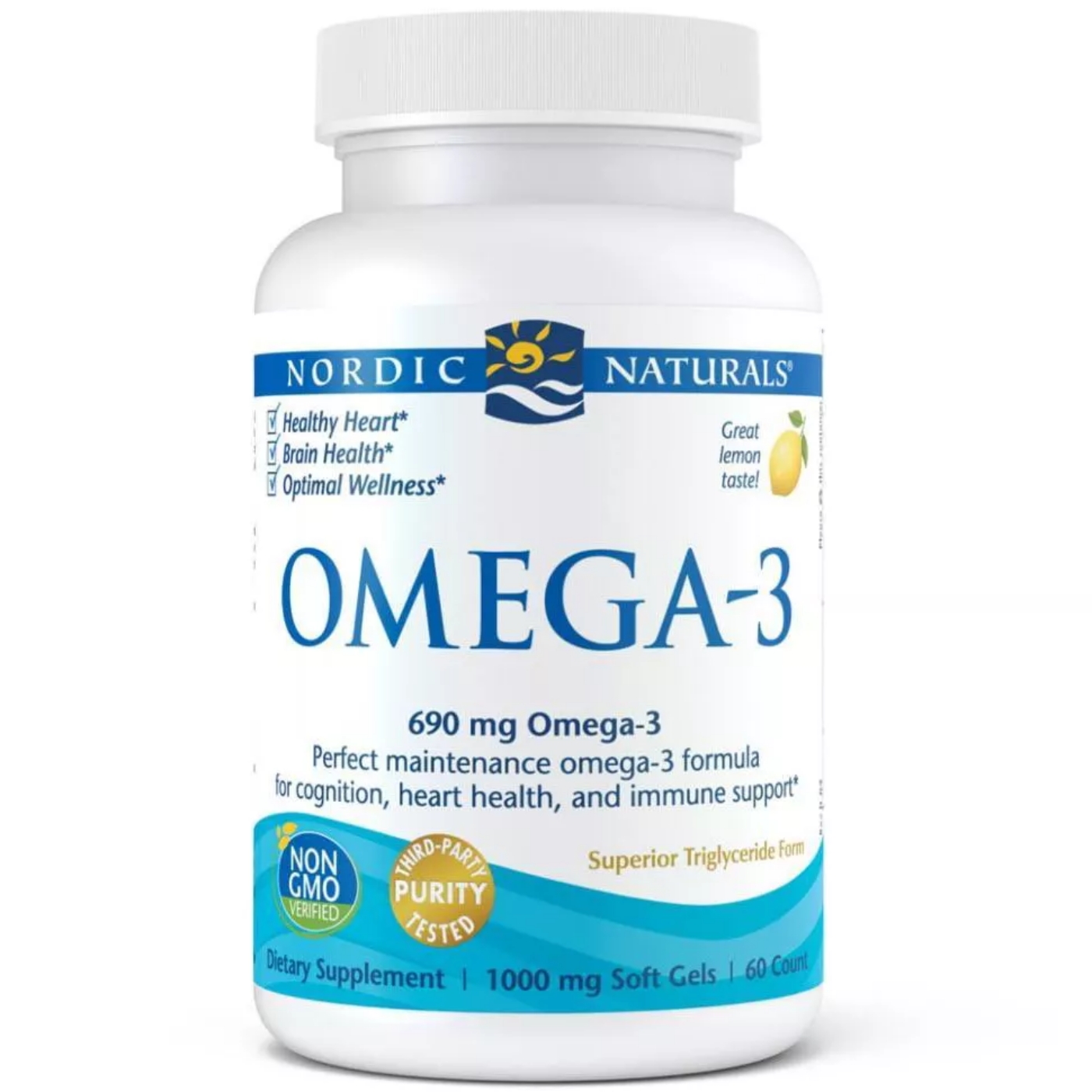 Nordic Naturals Omega-3 soft gels offer 690 mg of omega-3s in a natural concentration ...per serving, surpassing the expert-recommended dose of 500 mg per day. Adequate omega-3 intake is essential to support good nutrition and overall well-being, including healthy heart and brain function, as well as mood, cognition, and immune system support.